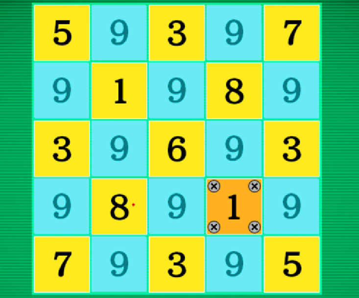 - 우측 하단에 있는 1은 고정되어 있고, 모든 파란색 칸이 9가 되도록 풀면 되는 퍼즐이다.