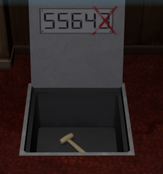 - 바닥이 열리고 '나무 망치'를 획득할 수 있고 "5564X"라는 힌트도 같이 얻을 수 있다.