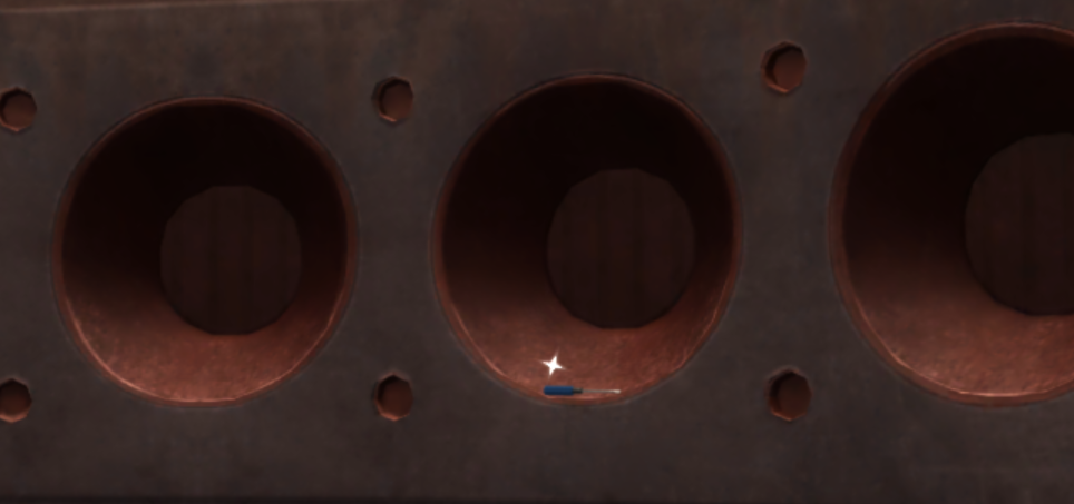 - 파이로 전환하기 전, 고글을 착용한 상태로 더스트 슈트를 살펴보면, 나사 2개와 드라이버가 나타난 것을 알 수 있다.