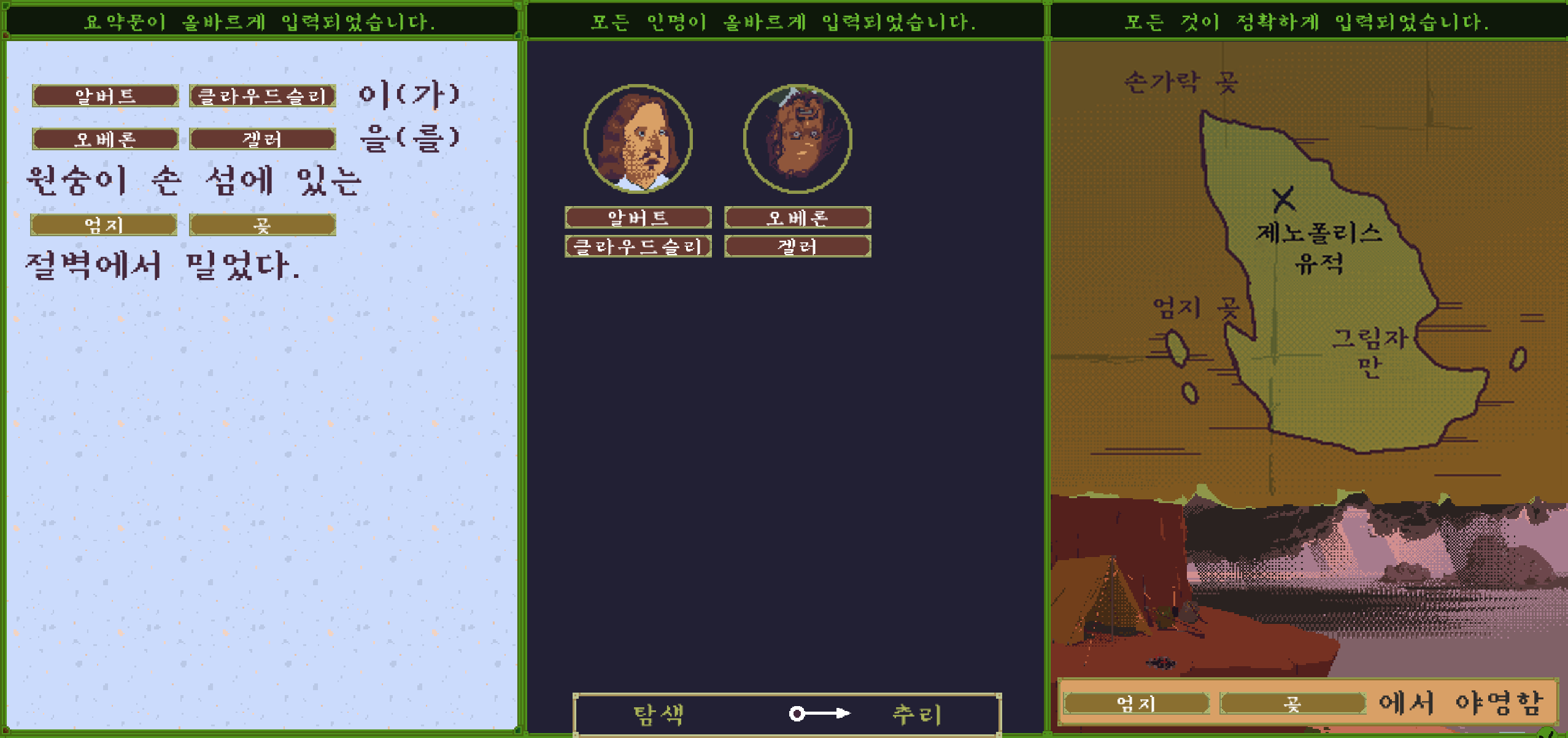 전체 공략은 하기 페이지를 참고 바랍니다. The Case of the Golden Idol (황금 우상 사건) 게임 공략 (tistory.com)  우선 첫번째 사건은 튜토리얼 성격의 사건으로 매우 간단하다. 우선 반짝이는 부분들