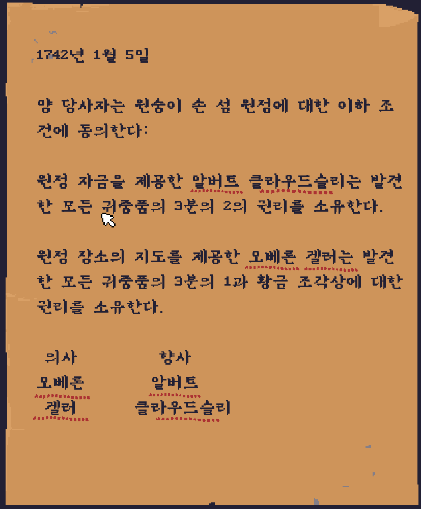 양쪽 다 이런 계약서를 가지고 있는데, 한명은 의사인 오베론 갤러, 나머지 한명은 향사인 알버트 클라우드슬리라는 것을 알 수 있다.