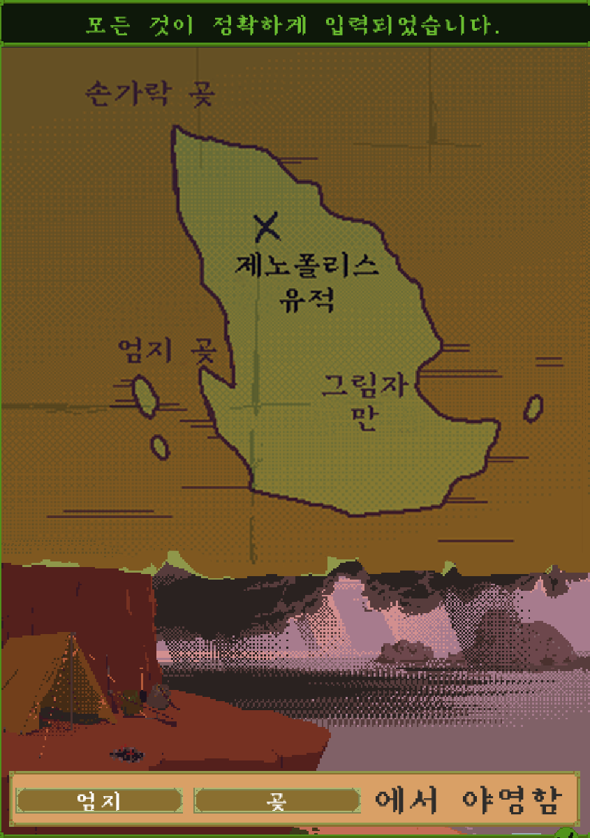 이제 사건이 일어난 장소를 추리해야 하는데, 멀리 섬 두개가 보인다. 섬 두개가 보이는 장소는 지도에서 엄지 곶이다.
