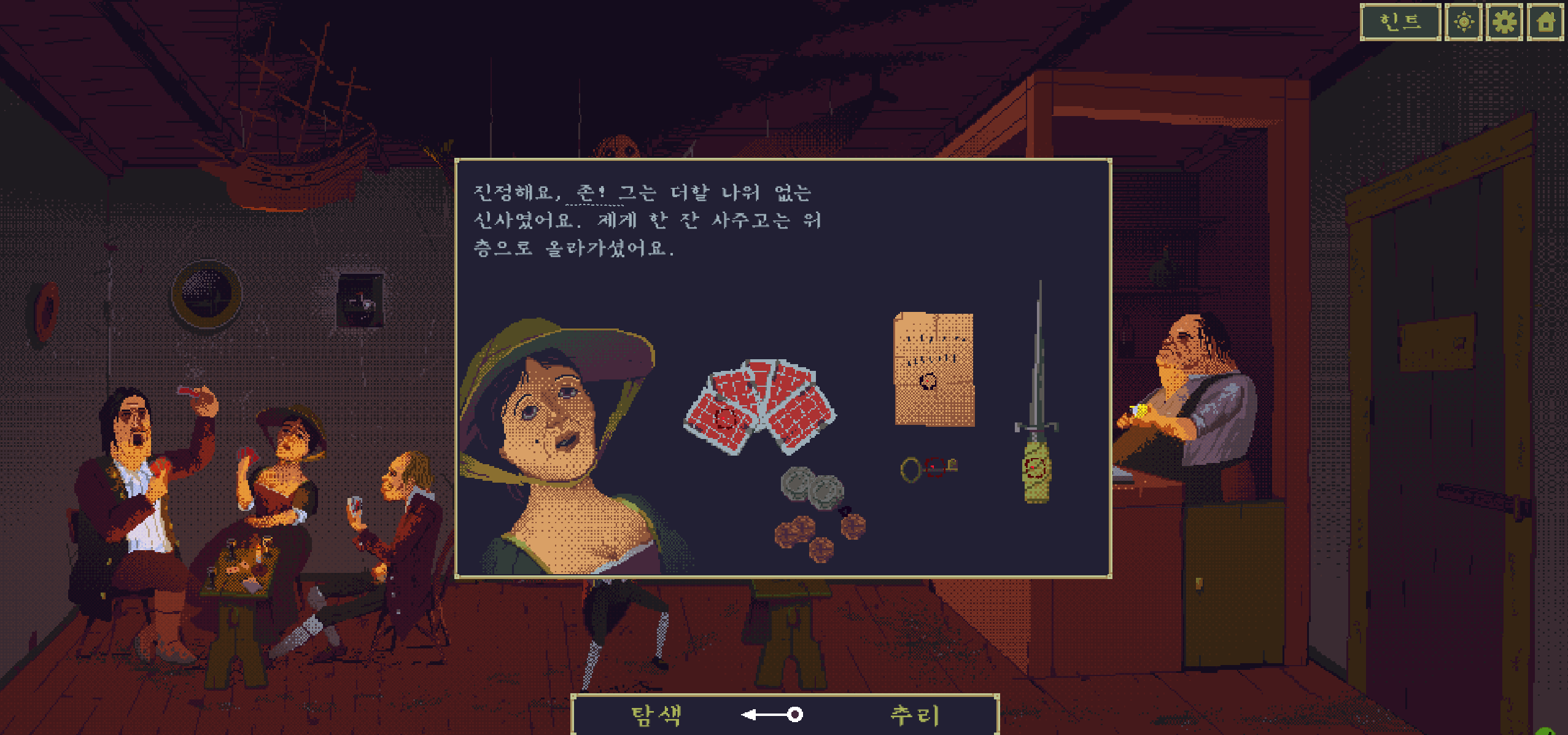 네번째 사건에 들어가면 시끌벅적한 여관 1층에서 세 사람이 카드놀이를 즐기고 있고, 연주자와 여관 주인으로 보이는 사람이 있다.