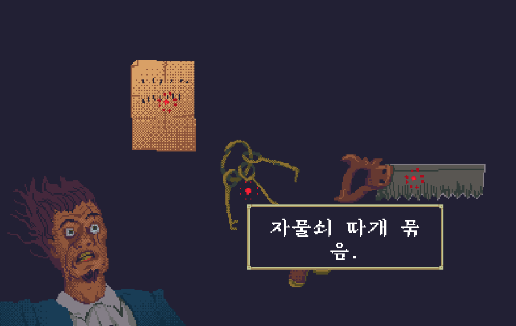 자물쇠 따개 묶음과 톱을 가지고 있다.(이 방은 자물쇠가 없어서 톱으로 자르고 들어왔다.