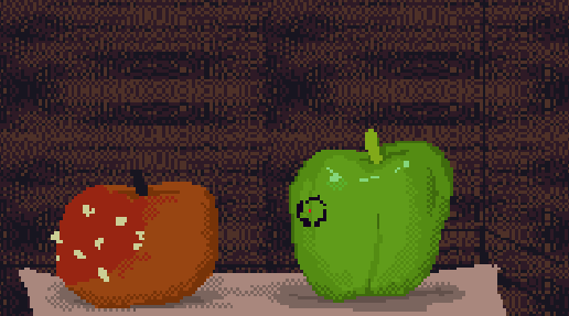 이 실험실용으로 쓰던 방에 사과가 있는데, 하나는 썩어가고 하나는 덜 익은 녹색이다.