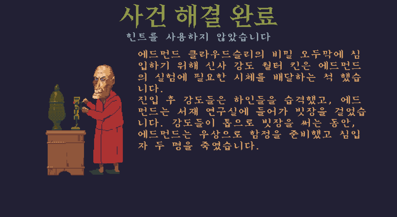 본 게시물은 인디게임 개발사 Color Gray Games에서 제작하고 2022년 10월 13일 출시한 포인트 앤 클릭 추리게임인 The Case of the Golden Idol의 공략을 다루고 있습니다. 본 공략은 한글패치 버전을 기준으