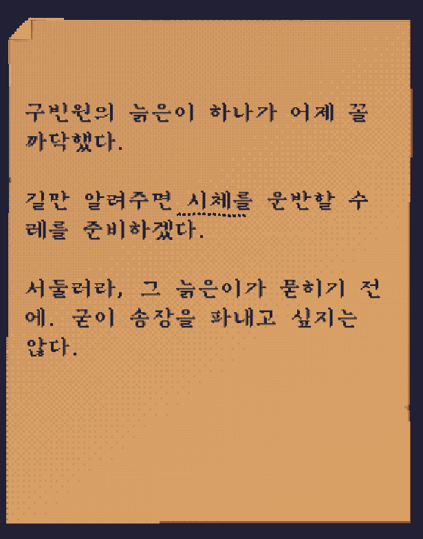 또 하나의 쪽지를 통해 이것이 최근에 사망한 자의 시체임을 알 수 있다.