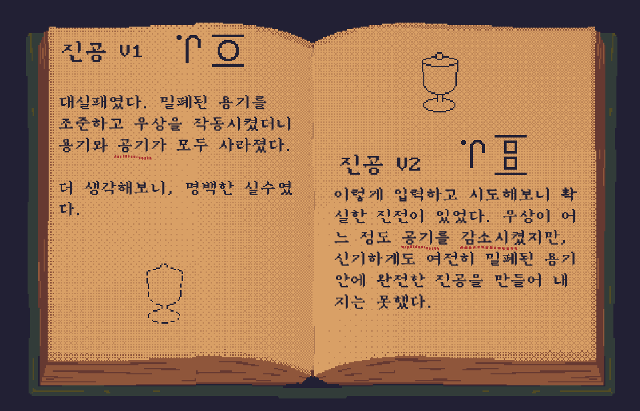 진공 V2는 공기가 감소하였고, 진공 V1은 물체가 사라졌다. 즉, 물체가 감소하였다.