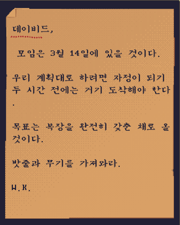 W.K.의 지시를 받고 목표를 습격한 것을 알 수 있고, W. K.은 윌터 킨일 가능성이 높아 보인다.