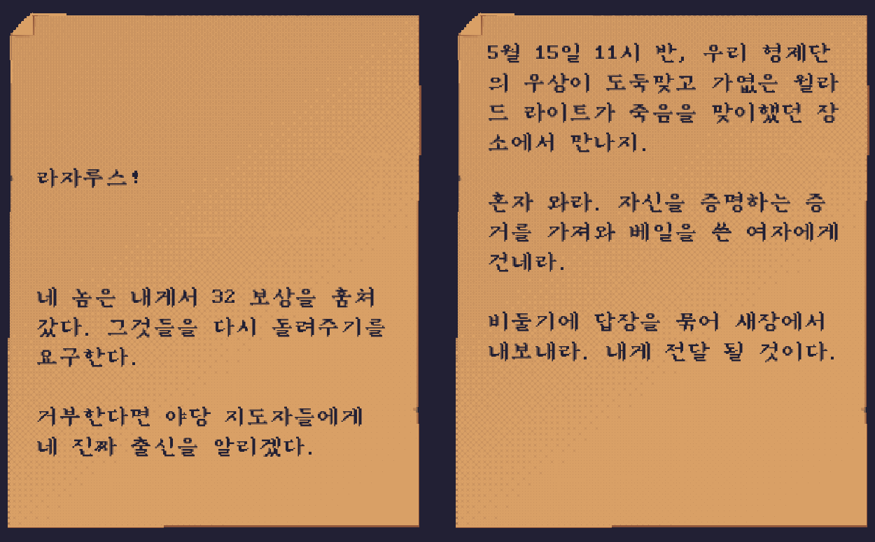 여관에 가서 이 쪽지를 받고, 라자루스 허스트와 월터 킨이 처음 대면한 오두막으로 온 것을 알 수 있다.