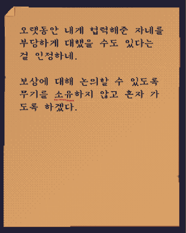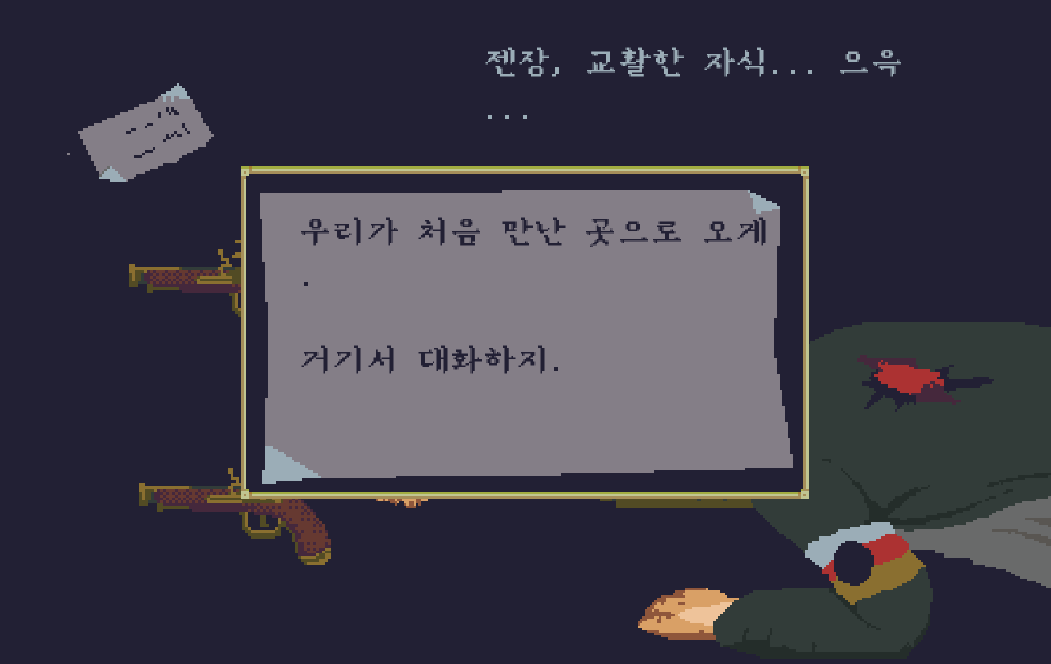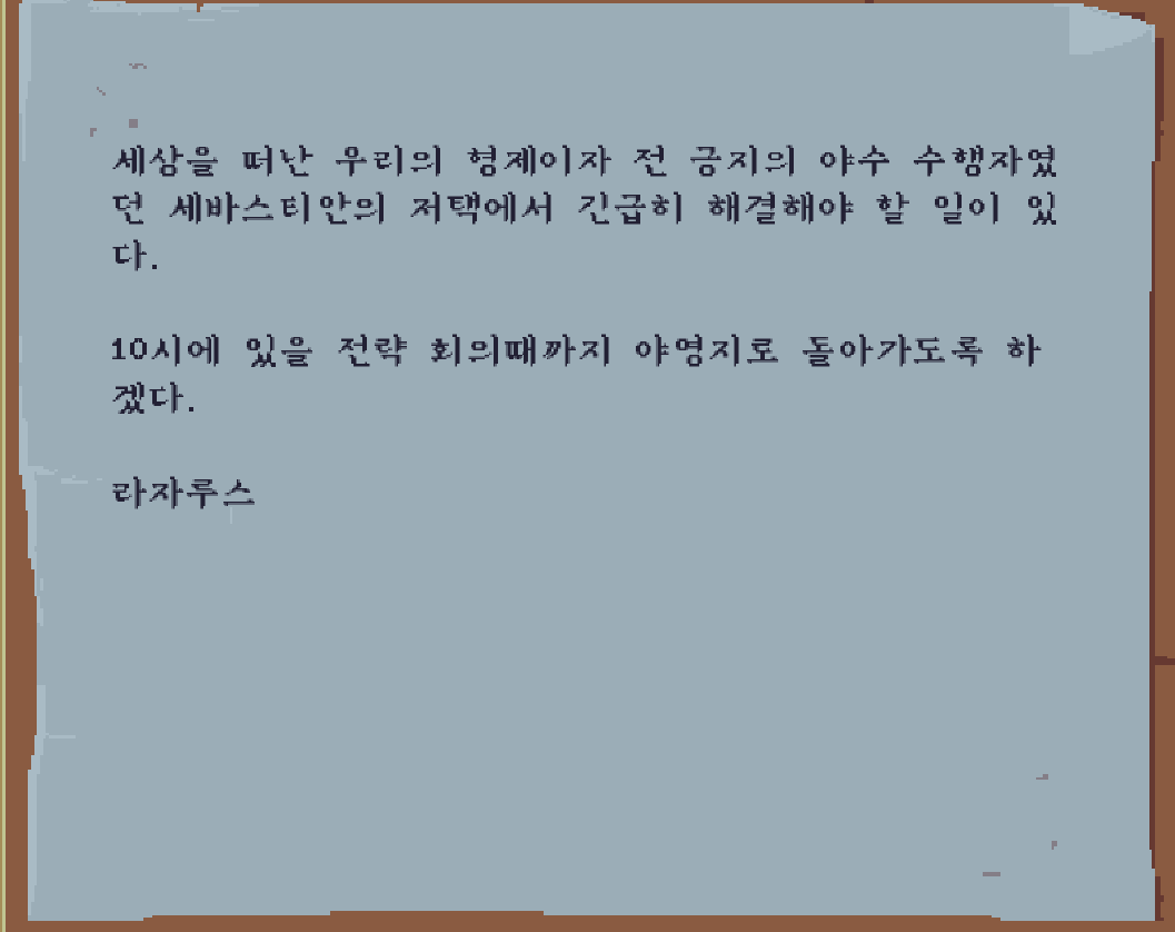 여관에 가서 이 쪽지를 받고, 라자루스 허스트와 월터 킨이 처음 대면한 오두막으로 온 것을 알 수 있다.