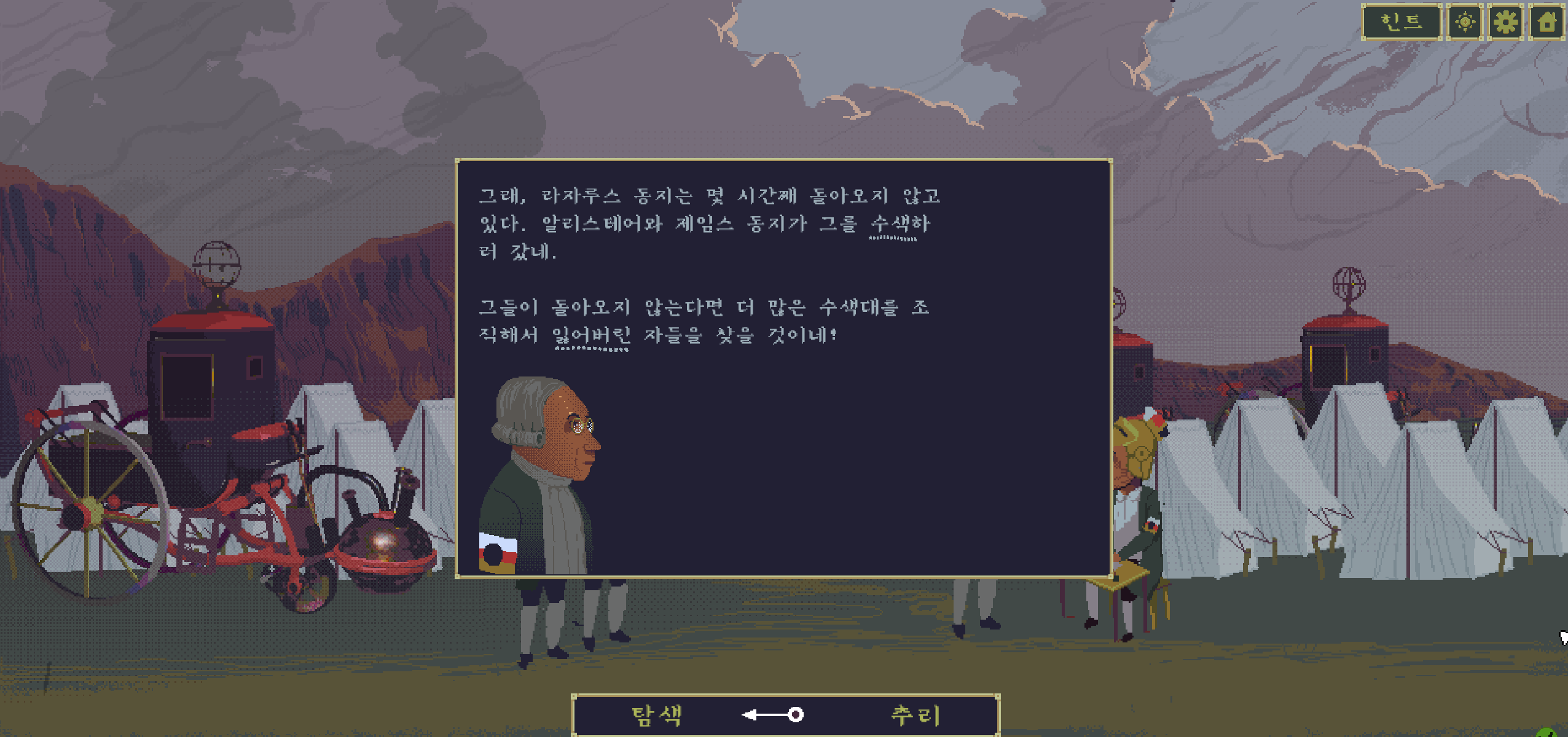 라자루스가 몇시간째 돌아오지 않아서, 알리스테어와 제임스가 수색하러 갔음을 알 수 있다.