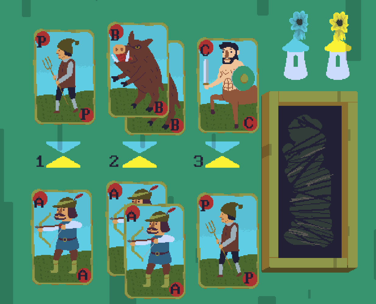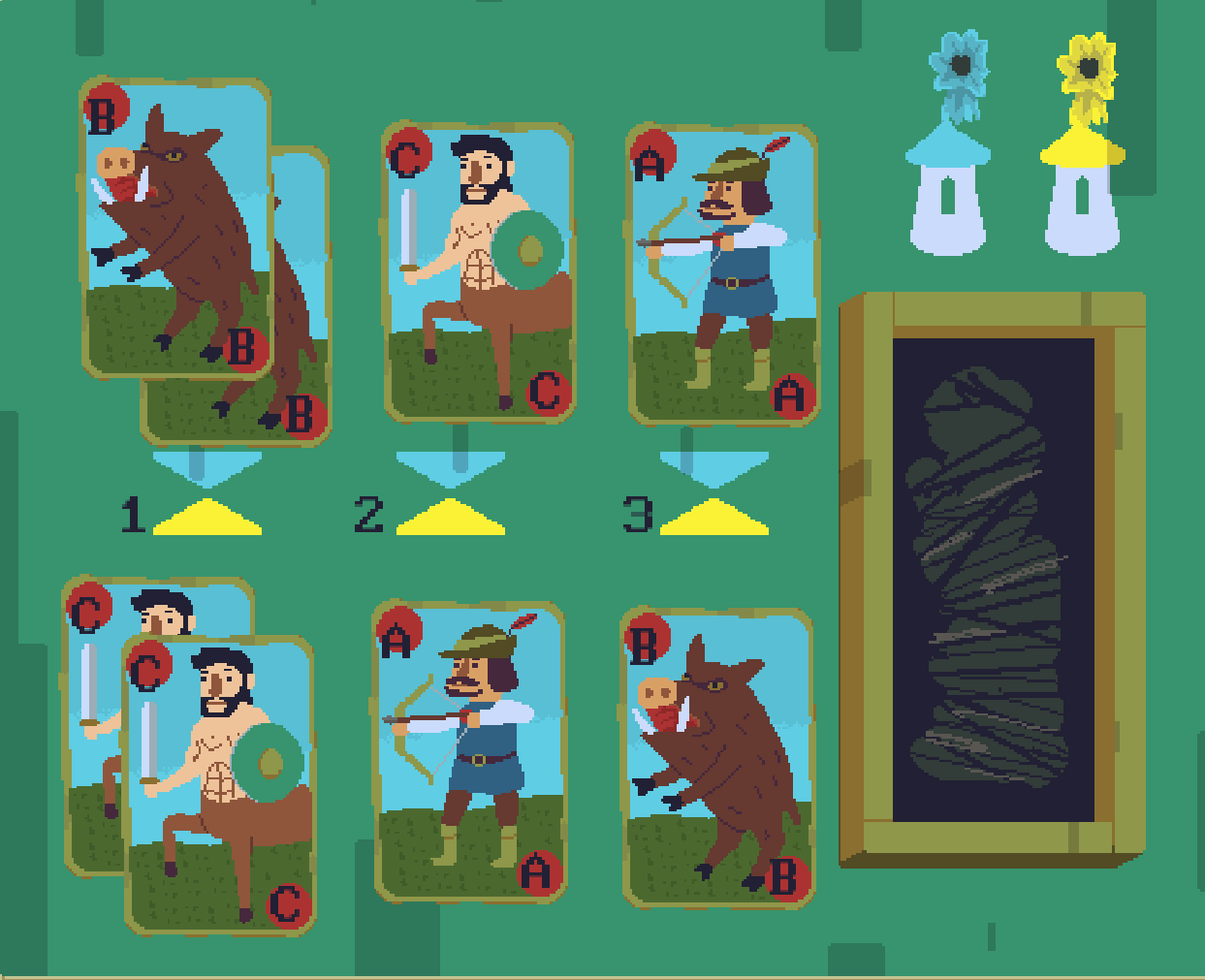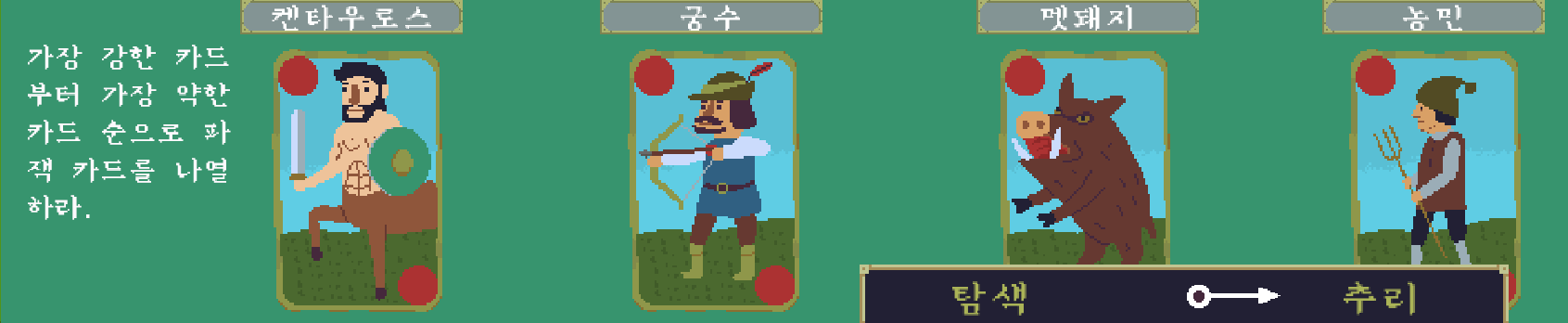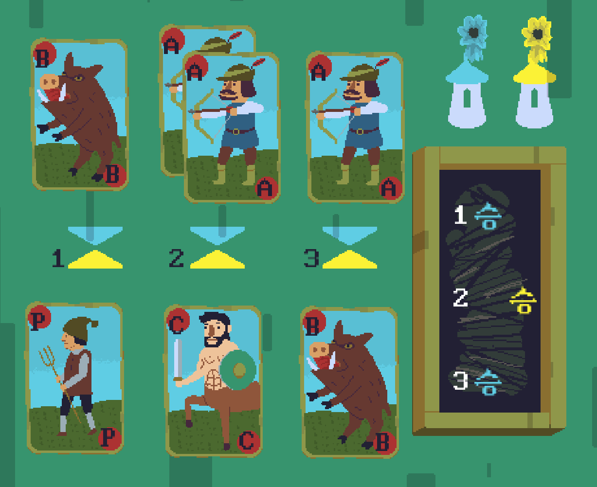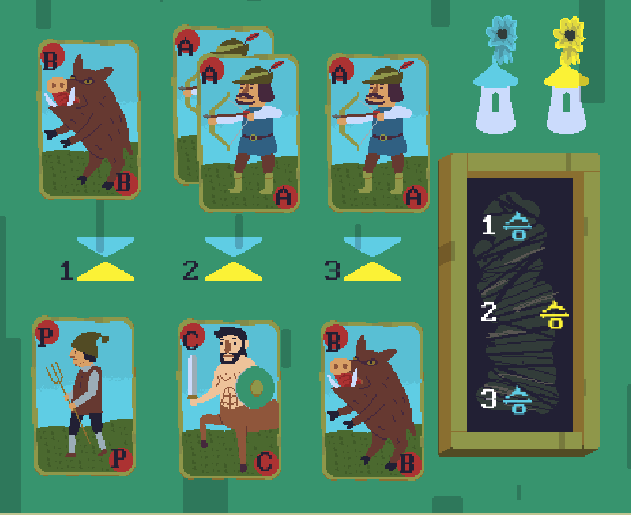 따라서 카드는 켄타우로스 > 궁수 > 멧돼지 > 농민 순서로 강한 것을 알 수 있다.