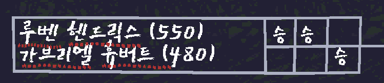 대진표를 보면 노란색 진영은 루벤 헨드릭스, 파란색 진영은 가브리엘 휴버트임을 알 수 있다.