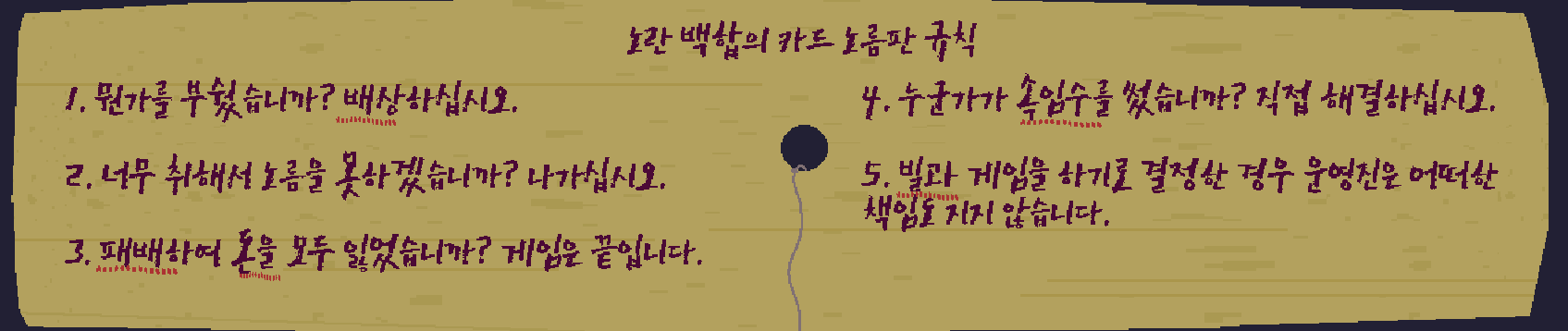 노름판 규칙을 참고하면 속임수를 쓰면 직접 해결하라고 돼 있고, 빌과 게임을 하기로 했으면 운영진은 책임을 지지 않는다고 하는 것을 보니