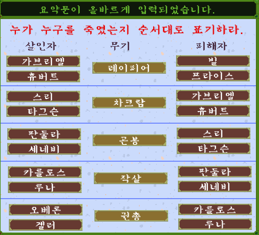 따라서 인명과 살인자, 무기, 피해자를 순서대로 완성할 수 있다.