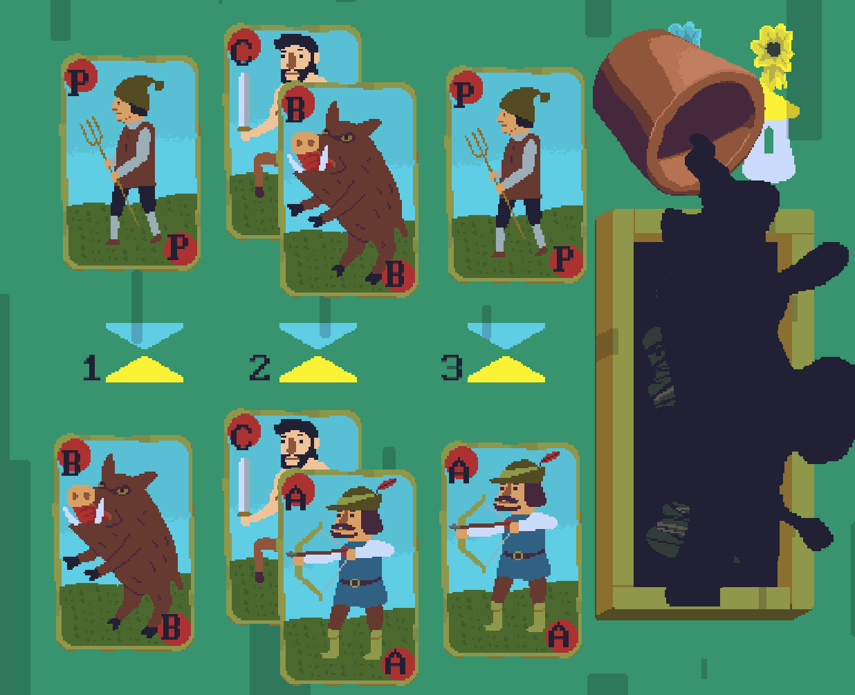 세 번째 게임에서 궁수 카드 한 장 vs 멧돼지 카드 한 장에서 궁수 카드가 승리했으므로 궁수 > 멧돼지