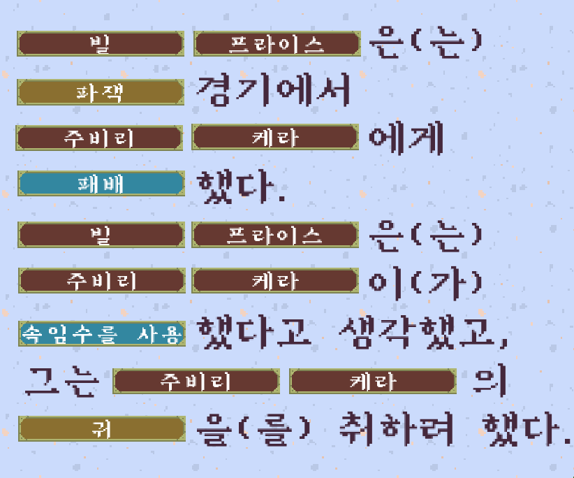 첫 게임은 노란색 진영의 승리, 두번째 게임은 파란색 진영의 승리, 세번째 게임도 파란색 진영의 승리이다.
