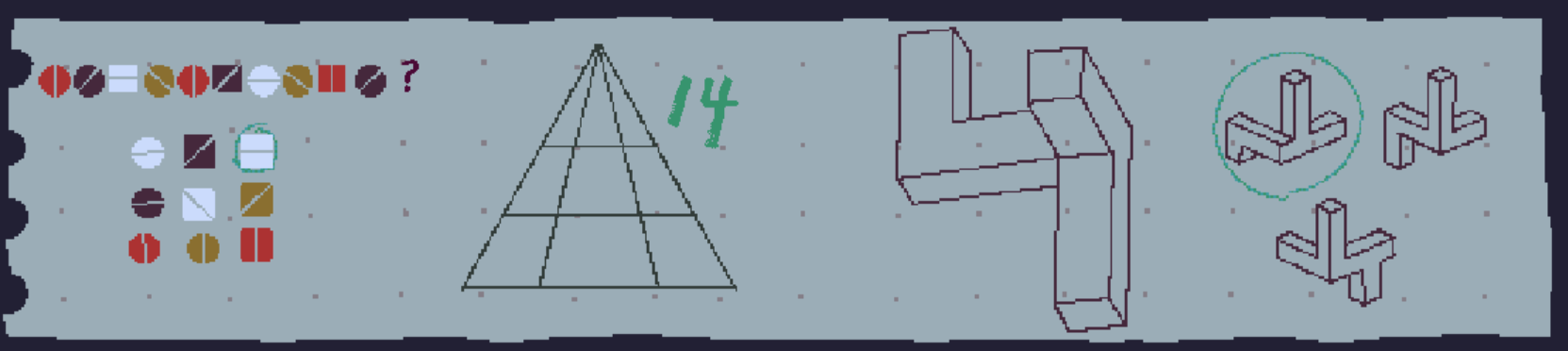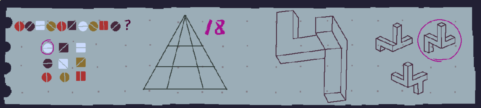 첫번째 문제는 선이 회전하므로 선은 누운 직선, 동그라미 동그라미 네모로 반복되므로 동그라미, 색은 4번마다 반복되므로 흰색