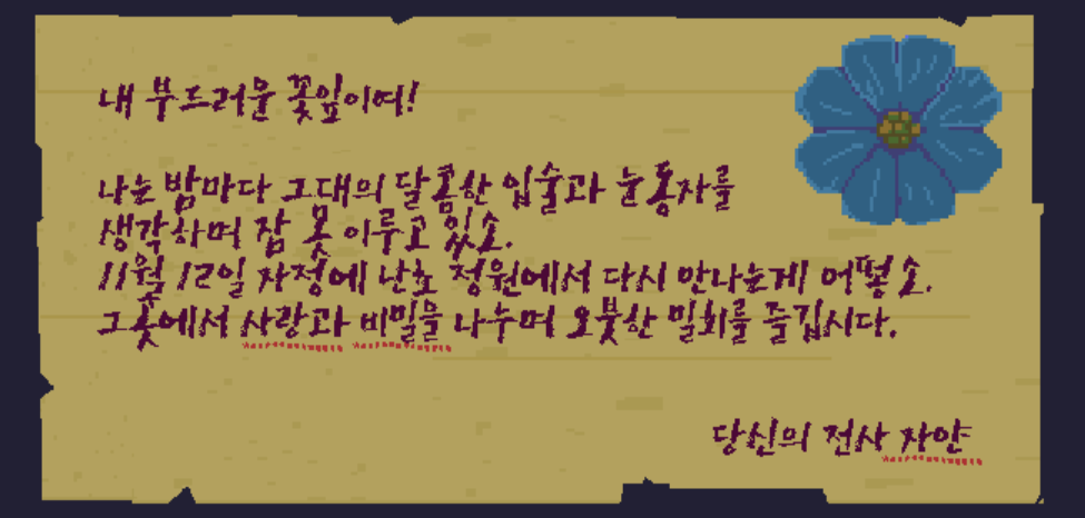 편지 내용은 아리라는 여성을 주비리가 좋아했으나 거절당한 내용이다.