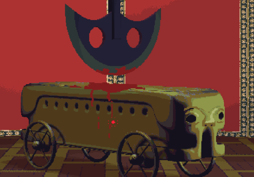 나무 앞치마 부분만 잘려 나가고 피 대용으로 붉은 물감이 터지도록 설계가 되어 있는 것이다.