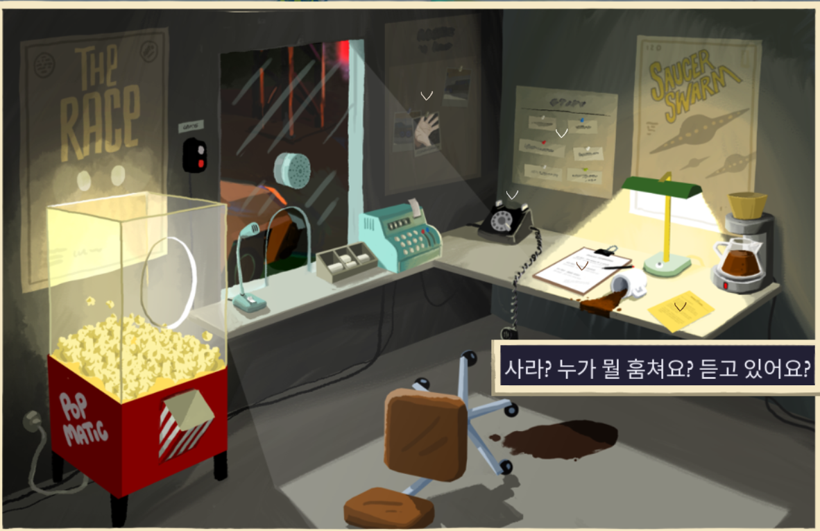 사무실 책상을 보면 이상한 여자가 계속 영화관에 전화를 해서 물건을 사려고 했고 아래 사람도 보냈으나 실패했다고 되어 있다.