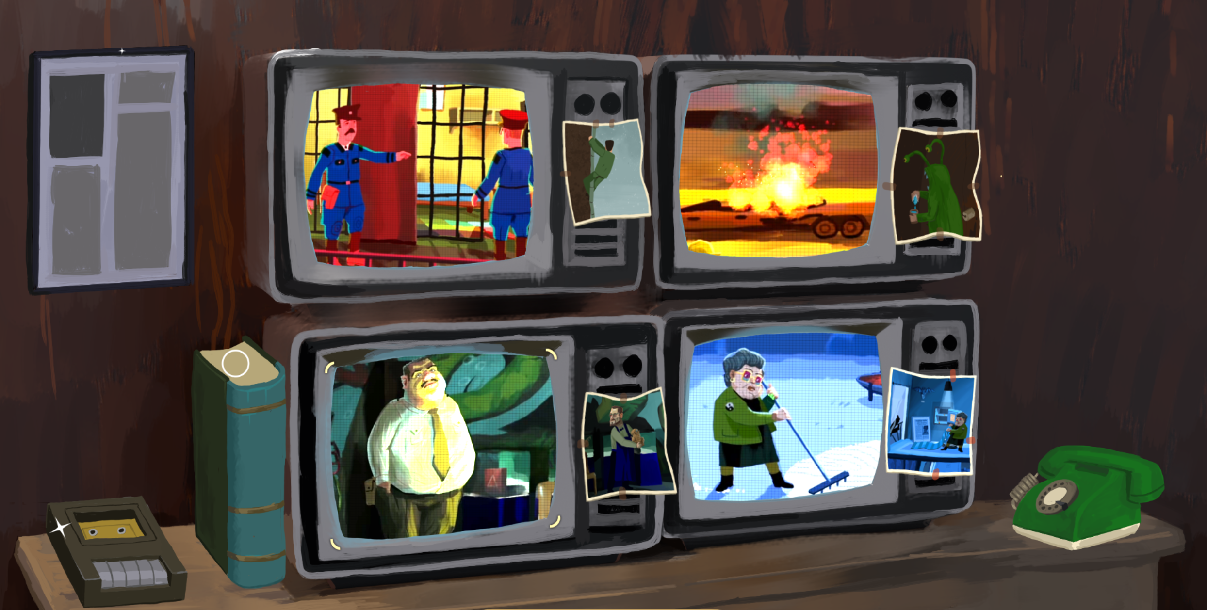 이 네가지 사건은 왼쪽 위(교도소)- 오른쪽 위(영화관) - 왼쪽 아래(경매장) - 오른쪽 아래(하모니 재단)