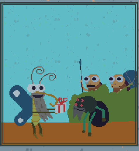 거미가 젋은 나비에게 술을 따라주고 있고, 젊은 나비는 무언가를 언급하고 있다.