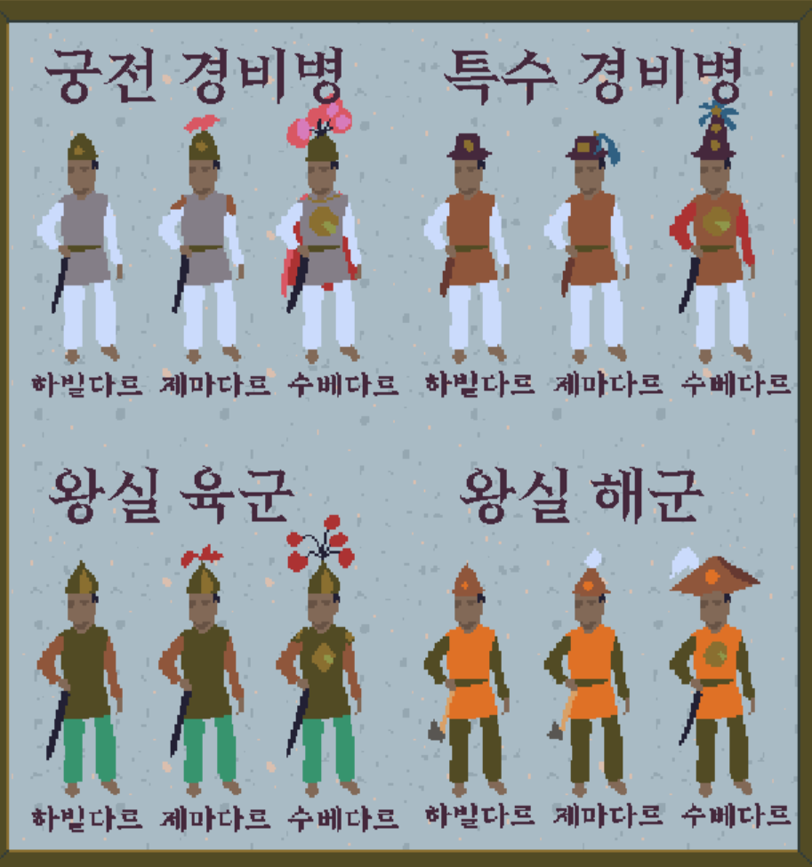이제 벽을 보면 병사별로 하빌다르 제마다르 수베다르로 계급이 있고 병종별로 복장이 다르다는 것을 알 수 있다.