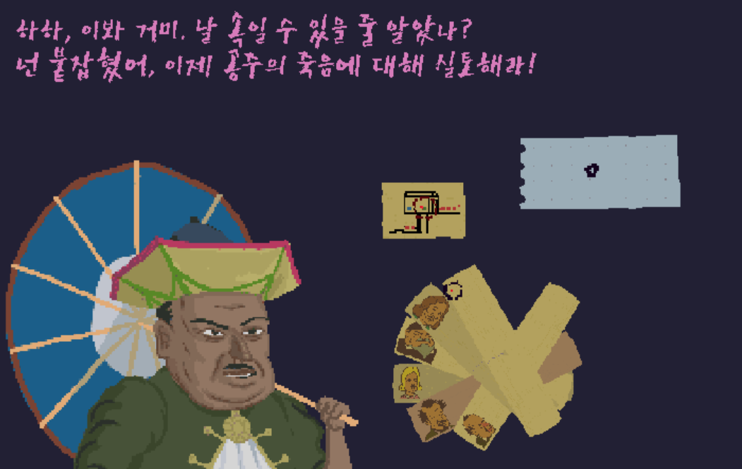 여기서 분장에 사용했던 천과 수염을 버리고 도망간 것을 알 수 있는데