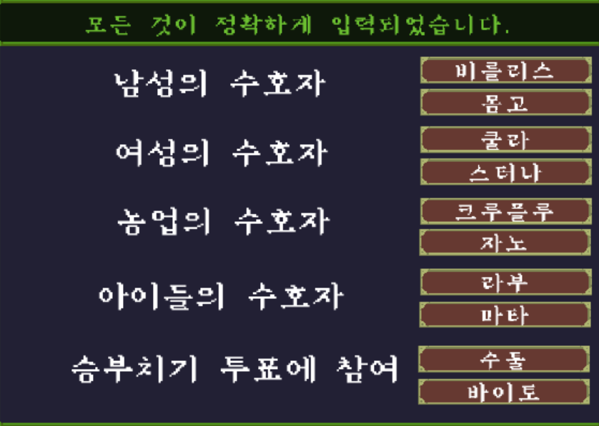 남성의 수호자, 여성의 수호자, 농업의 수호자, 아이들의 수호자 이렇게 4명이 의회의 구성원인 것 같다.