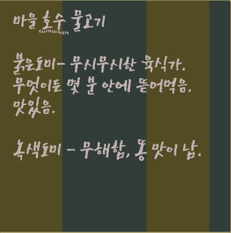 호수 옆 오두막에 가면 과일과 생선의 특징이 적혀 있는데