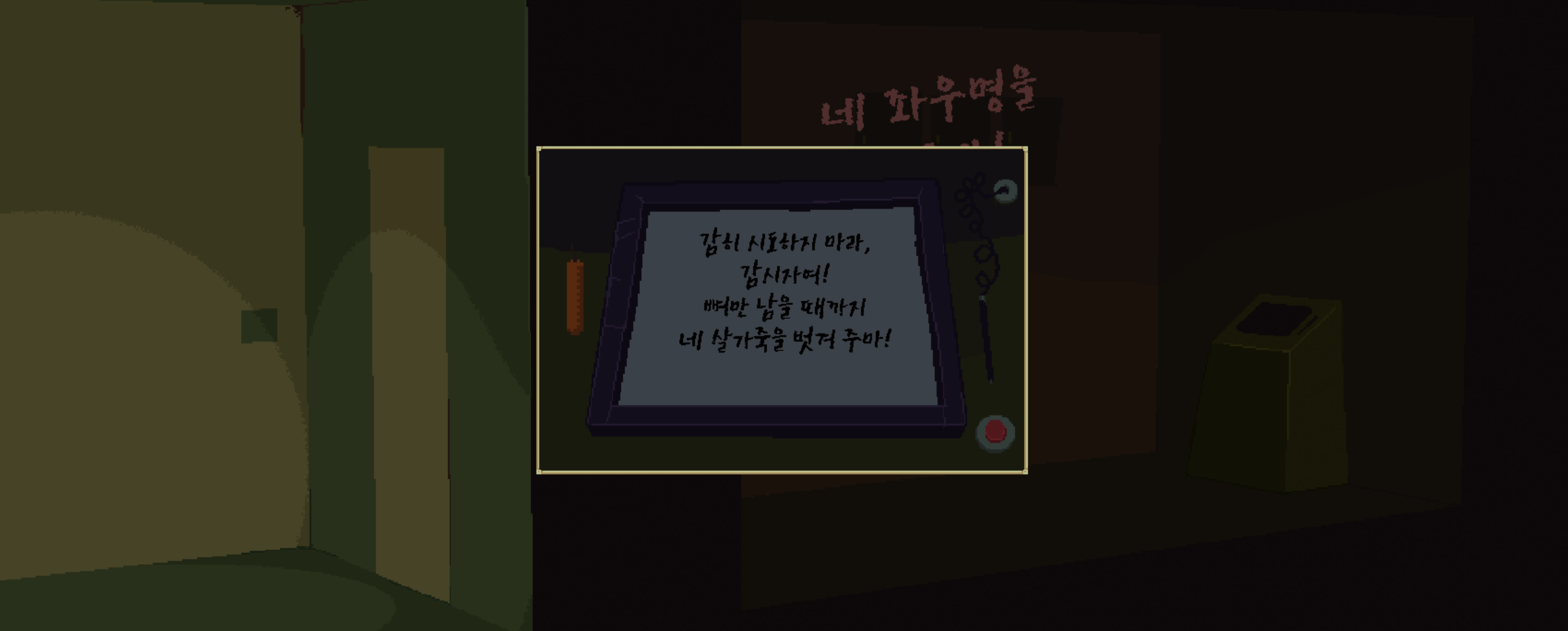 벽 앞에 보면 거주자가 보낸 듯한 감시자에 대한 협박 멘트가 남아 있다.